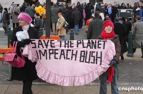 當(dāng)?shù)貢r(shí)間一月二十日,在美國(guó)總統(tǒng)布什就職典禮場(chǎng)外,一些示威者抗議布什當(dāng)政,要求彈劾總統(tǒng)。作者:余東暉