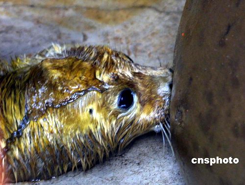 | 2005年1月24日早晨,在秦皇島海洋歡樂公園的水族館內(nèi),一只出生僅一天的小斑海豹全身覆蓋著土黃色的皮毛,在媽媽的產(chǎn)房內(nèi)享受著母愛。據(jù)了解,這只可愛的小海豹在秦皇島市是人工喂養(yǎng)條件下降生的第一只小海豹,它的媽媽名叫“公主”,是6年前來到港城的,經(jīng)過幾年的人工喂養(yǎng),2004年10月份訓(xùn)養(yǎng)員發(fā)現(xiàn)溫順的公主懷孕了,在為其安排了一間單獨的產(chǎn)房后,1月23日早晨4點左右時,工作人員聽到公主奇特的叫聲,5點多時,發(fā)現(xiàn)公主身邊多了一只小海豹和一堆胎盤。斑海豹別名海豹、港海豹,海豹科Phocidae,分布主要在渤海、黃海、東海也有發(fā)現,個別遠達南海,屬國家二級保護動物。也是惟一在我國渤海沿岸繁殖的鰭腳類動物。學(xué)忠 攝