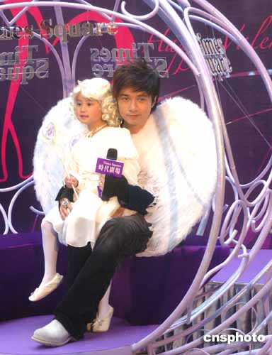 香港歌星古巨基與一小天使25日來(lái)到香港時(shí)代廣場(chǎng)﹐登上為情人節(jié)特別裝飾的“愛神丘比特南瓜車”上﹐傾訴他的深情蜜語(yǔ)﹐迎接情人節(jié)的到來(lái)。作者:趙振清