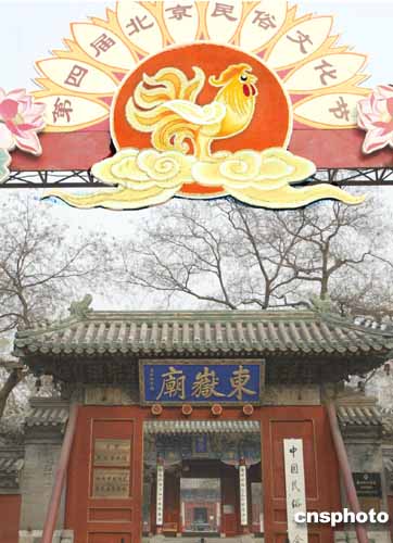 “第四屆北京民俗文化節(jié)暨第七屆東岳廟春節(jié)文化廟會”將于二月八日至十五日在北京道觀東岳廟舉行,圖為裝飾一新的東岳廟懸掛起“金雞報春”圖。作者:錢興強(qiáng)