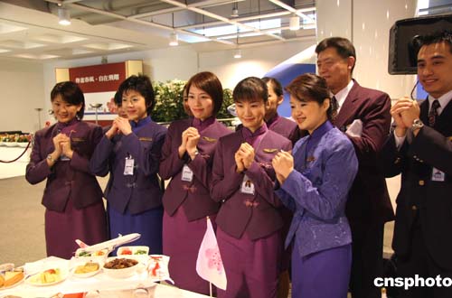 在身著深紫和深藍(lán)套裝的空中小姐中,穿一身筆挺西裝的“空中先生”孫建豪格外醒目。他介紹,“華航”擁有空中服務(wù)人員五千多位,其中男性有一千多位。所以,剛剛走出校園才從業(yè)一年的他,五天前得知將飛首航,心情非常激動。他說,我平時就喜歡了解大陸的習(xí)俗風(fēng)情,父母也都去那邊旅游。此次是第一次去大陸、去北京,十分希望在短暫的地停時間抽空出去四處看看。