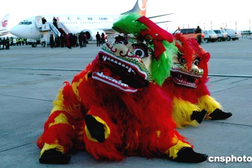 中國國際航空公司的CA1087/8航班一月二十九日上午七時四十六分從北京首都國際機場出發(fā)飛往臺北,這是五十六年來大陸民航班機首度飛往臺灣。圖為首航儀式上的舞獅表演。作者:滿會喬