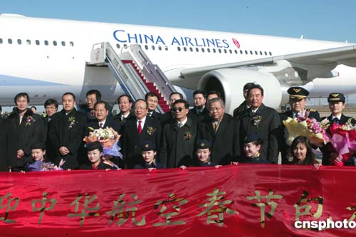 中午十一時(shí)五十八分,隨著從空中傳來的由遠(yuǎn)而近的飛機(jī)轟鳴聲,一架臺(tái)灣中華航空公司所屬的航班號(hào)為CI-581的空客A330-300出現(xiàn)在人們的視野里。人群里發(fā)出一片熱烈的掌聲和歡呼聲。飛機(jī)平穩(wěn)降落后,緩緩地在跑道上滑行,靠泊在預(yù)定位置上。