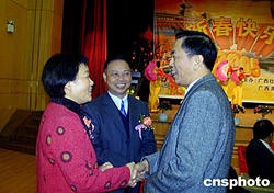 一月三十日,“二○○五年廣西首府僑界迎春茶話會”在南寧舉行,三百多名僑界人士到會,世界廣西同鄉(xiāng)聯誼會主席陳奇培、馬來西亞廣西總會會長孔慶庶等海外僑領也出席了茶話會。廣西自治區(qū)政府副主席劉新文女士(左)、廣西自治區(qū)僑辦主任李漢金(中)和出席茶話會的海外僑領親切交談。作者:劉萬強
