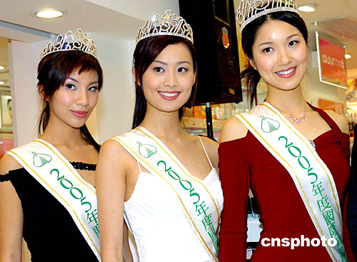 2005年香港度國(guó)際華裔小姐競(jìng)選冠軍李亞男、亞軍陳法拉、季軍楊文琪,日前在頒獎(jiǎng)儀式上亮相,并為香港一家化妝品店?duì)I銷造勢(shì)。中新社記者:宋吉河