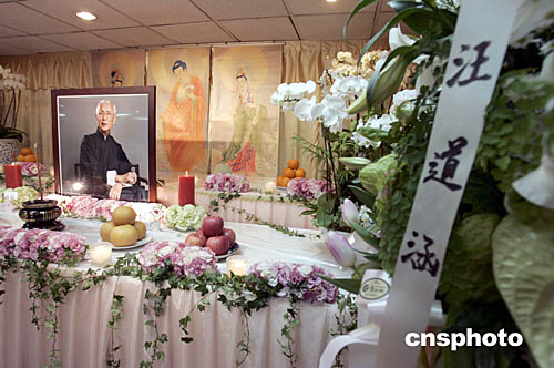 孫亞夫、李亞飛今天下午作為汪道涵先生的個(gè)人代表抵達(dá)臺(tái)北來靈堂吊唁辜振甫先生。圖中辜先生靈堂擺設(shè)有汪道涵先生贈(zèng)送的花籃。(臺(tái)灣;鶗(huì)故董事長辜振甫先生治喪工作小組提供)中新社記者:邢利宇