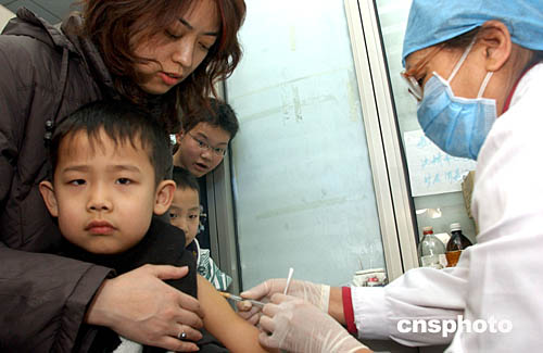 二月二日,北京市疾病控制中心醫(yī)務(wù)人員為一名兒童接種流腦“A+C”疫苗。北京近日從蘭州緊急調(diào)運(yùn)了十萬(wàn)份疫苗,今天下午已開始市民進(jìn)行接種。截止到目前,北京至今未發(fā)現(xiàn)C群流腦疫情。作者:韓藝冰