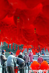 二月三日,北京地壇廟會喜慶火紅的燈籠吸引了提前逛廟會的游客。北京久負(fù)盛名的地壇廟會準(zhǔn)備工作已接近尾聲。作者:韓藝冰