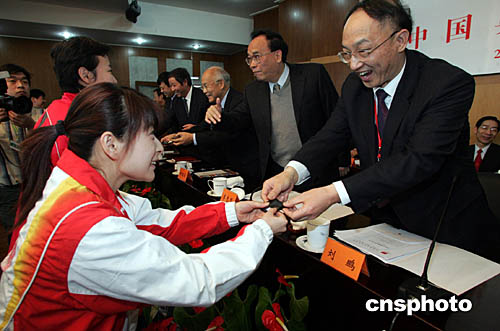 會(huì)上,中國奧委會(huì)領(lǐng)導(dǎo)向在雅典獲得獎(jiǎng)牌的運(yùn)動(dòng)員代表郭晶晶、馮坤、張寧等頒發(fā)了國際奧委會(huì)授予的奧林匹克紀(jì)念章。
