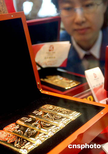 奧運歷史上首次發(fā)行的這批奧運金條,由北京奧組委授權,中國印鈔造幣總公司和中國金幣總公司聯(lián)合發(fā)行,在全國僅限量發(fā)行2008公斤。菜百業(yè)務部李經(jīng)理告訴記者,鑒于北京銷售火爆,菜百將在首批首罄后向中國金幣總公司申請引進第二批奧運金條。(記者 楊開然)