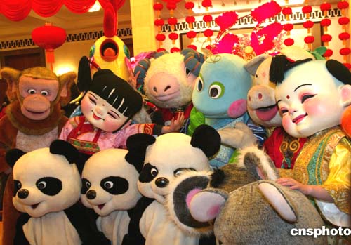 走進張燈結彩的人民大會堂,噴泉涌動,鮮花爭艷,迎面兩個賀歲的“阿!睋碇皦坌恰毕蛉藗児зR新喜,彩燈閃爍的“!弊直磉_著新春的祝福。大型充氣“雞型”、“龍型”滑梯和“燈籠”、“蘑菇”城堡成了孩子們的樂園。