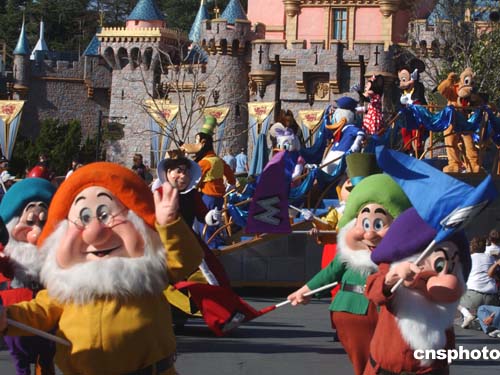 美國(guó)洛杉磯迪斯尼樂(lè)園白雪公主和卡通明星大巡游,與觀眾歡天喜地一起迎接二月春回大地。作者:賈國(guó)榮