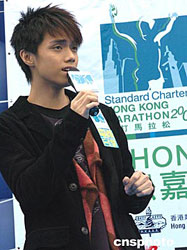 圖為香港歌手張敬軒和余文樂19日在香港金紫荊廣場出席2005渣打馬拉松(香港)嘉年華活動﹐為觀眾獻(xiàn)歌。