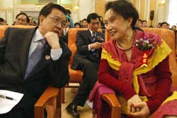 “2004中華十大財智人物”評選活動,二月二十六日在北京人民大會堂舉行頒獎儀式。博鰲亞洲論壇秘書長龍永圖(左)獲得“2004中華十大財智人物”特別獎。伊世曼柯達公司全球副總裁、大中華區(qū)主席葉鶯獲得年度獎。作者:任海霞