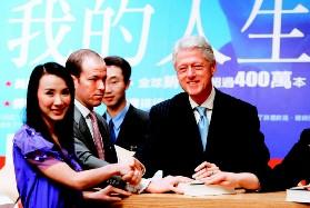 在排隊簽名的人龍中,有一名穿著紫色雪舫衫,黑色花裙亮眼的美女書迷,認出來了嗎?她就是美女蕭薔,平常都是被粉絲包圍的蕭薔,今天成了美國前總統(tǒng)克林頓的超級粉絲。蕭薔說:“恭喜出書。”前美國總統(tǒng)克林頓則回答:“謝謝!