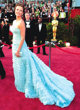 作為奧斯卡上屆影后的查理茲·塞隆,今年當然不能在服裝上輸給“小輩”。一層層的細紗打成小褶羅列成寶塔形,讓人一望就是工藝不凡。層層疊疊的感覺外加淡淡的藍綠色調,讓這位美女就像美人魚一般美麗動人。