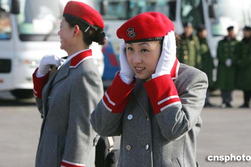 十屆全國人大三次會議三月四日在北京人民大會堂舉行預(yù)備會議,由于冷空氣來臨,負(fù)責(zé)導(dǎo)引代表參會的禮儀小姐在天安門廣場上顯得“美麗凍人”。作者:湯彥俊