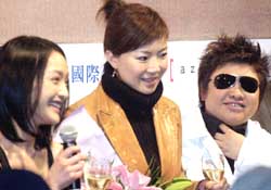 三月六日,在北京舉行的中國內(nèi)地影視、歌壇紅星周迅新專輯《偶遇》上市發(fā)行儀式上,內(nèi)地歌手韓紅(右)、葉蓓(中)在會上向周迅表示祝賀。作者:錢興強(qiáng)