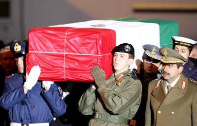 據(jù)路透社報(bào)道,遭駐伊拉克美軍射殺的意大利特工遺體被送返國內(nèi)時(shí),獲得英雄式的歡迎?ɡ屠锏墓啄居蒀-130軍機(jī)在3月5日午夜送抵羅馬錢比諾機(jī)場。當(dāng)覆有意大利國旗的卡利巴里棺木由儀仗隊(duì)抬出時(shí),他的母親和女兒都泣不成聲。