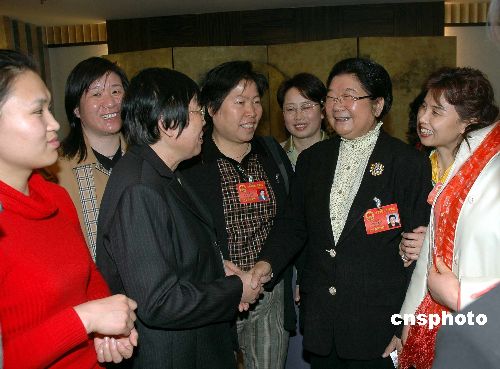 3月8日,全國(guó)人大常委會(huì)副委員長(zhǎng)、全國(guó)婦聯(lián)主席顧秀蓮來(lái)到出席十屆全國(guó)人大三次會(huì)議的山東代表團(tuán)駐地,看望山東代表,并向女代表祝賀節(jié)日。作者:王輝