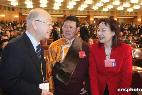 十屆全國(guó)人大三次會(huì)議第三次全體大會(huì)三月九日在北京人民大會(huì)堂舉行,出席會(huì)議的澳門(mén)代表李鵬翥(左一)與青海代表才福旦(左二)、陜西代表于文一起交談西部發(fā)展問(wèn)題。作者:毛建軍