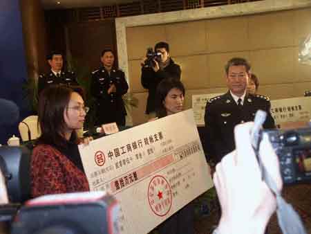 中新網(wǎng)3月10日電 據(jù)公安部網(wǎng)站消息,今天上午,公安部舉行公開懸賞通緝抓獲大毒販劉招華獎金兌現(xiàn)儀式,向廣西壯族自治區(qū)2名提供劉招華線索的群眾兌現(xiàn)獎金各10萬元,并同時頒發(fā)抓獲另一公開懸賞通緝的毒販馬順蘇的獎金5萬元?紤]到舉報群眾的安全,獎金分別由廣西、云南公安機關有關同志在兌現(xiàn)儀式中代領。