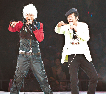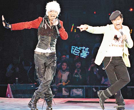中新網(wǎng)3月11日電 據(jù)《東方日?qǐng)?bào)》報(bào)道,古巨基演唱會(huì)前晚邀請(qǐng)了郭富城做嘉賓,兩人在臺(tái)上斗跳勁舞,掀起全場高潮,基仔還笑言在城城身上“采陽補(bǔ)陰”,學(xué)成一身舞技,城城搞笑回應(yīng):“怪不得我現(xiàn)在變的這么瘦了”令全場大笑。