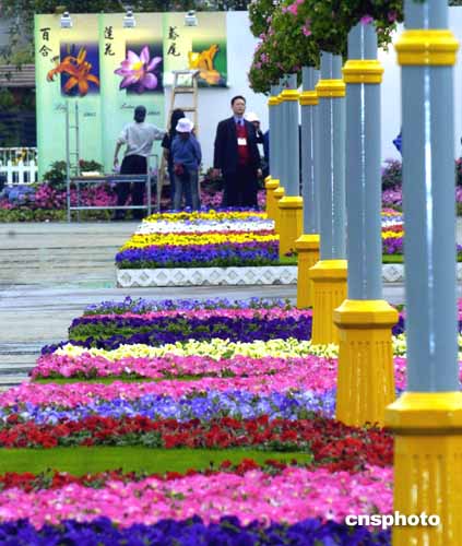 進(jìn)入花卉展,最當(dāng)眼的是一只大約十米高的大公雞,它不時(shí)發(fā)出“喔、喔、喔”的啼叫聲。原來,這是只由上萬朵花卉精心扎成錦雞。與它遙相呼應(yīng)的,是一對飛舞的火鳳凰,也是由鮮花扎制。主辦方希望以此為復(fù)蘇的香港報(bào)曉,祝愿香港騰飛。