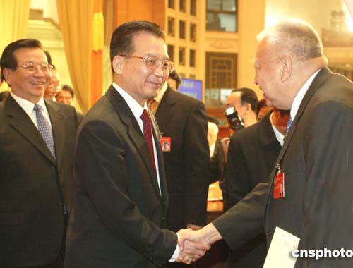 三月十二日,全國政協(xié)十屆三次會(huì)議在北京閉幕。國務(wù)院總理溫家寶、國家副主席曾慶紅向新增選的全國政協(xié)副主席董建華表示祝賀。作者:廖文靜