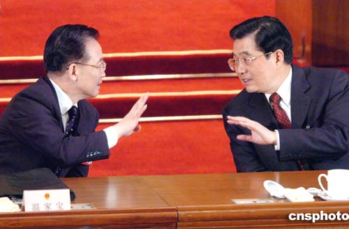 三月十三日上午,十屆全國人大三次會議第四次全體大會在北京人民大會堂舉行,人大代表投票選舉中華人民共和國中央軍事委員會主席。圖為胡錦濤與溫家寶在主席臺上交談。作者:陳文
