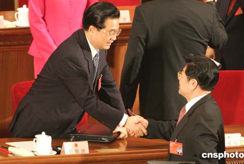 圖:胡錦濤與王兆國握手祝賀反分裂國家法高票通過