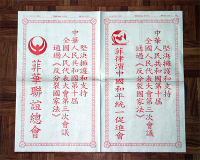 3月14日,《反分裂國家法》以高票通過后,菲律賓中國和平統(tǒng)一促進(jìn)會(huì)、菲華各界聯(lián)合會(huì)、菲律賓晉江同鄉(xiāng)會(huì)、菲律賓中國洪門致公黨總部、菲律賓石獅同鄉(xiāng)會(huì)、菲律賓僑中學(xué)院等社團(tuán)和文教單位,立即在各大華文報(bào)紙上刊登大幅套紅賀詞,堅(jiān)決擁護(hù)和支持全國人大通過的《反分裂國家法》。