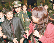 中新網(wǎng)3月17日電 據(jù)香港《大公報》報道,二○○五年度中國十佳勞倫斯冠軍頒獎典禮昨晚在深圳舉行,出席運動員有劉翔、田亮等,頒獎嘉賓則有劉嘉玲、成龍、郭富城等,運動員與明星互相輝映,星光熠熠,在場夾道歡迎的Fans為之瘋狂。當中又以田亮表現(xiàn)最為親切,他主動走向前同F(xiàn)ans“giveme five”,令Fans們樂開懷?磥硖锪廖从惺芘c吳敏霞緋聞影響。