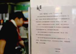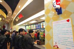 三月十七日,上?系禄诓蛷d里張貼聲明,解釋“蘇丹紅一號事件”。十六日晚,在肯德基新奧爾良烤翅和新奧爾良烤雞腿堡調(diào)料中發(fā)現(xiàn)了“蘇丹紅一號”成分。為了確保萬無一失,該公司決定立即在全國所有肯德基餐廳停止售賣新奧爾良烤翅和新奧爾良烤雞腿堡兩種產(chǎn)品,同時銷毀所有剩余調(diào)料。圖為徐家匯一家肯德基餐廳里張貼了聲明。作者:潘索菲