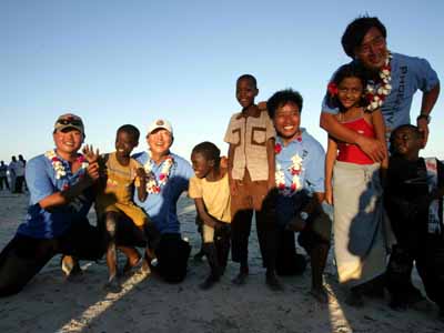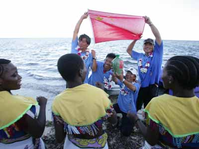 當(dāng)?shù)貢r(shí)間十九日晚,肯尼亞的專業(yè)合唱團(tuán)體以及少兒演員載歌載舞歡聚一堂,在蒙巴薩白沙海灘,以獨(dú)特的非洲風(fēng)情歌舞,盛迎抵達(dá)蒙巴薩的“鳳凰號”,以及前來迎接鳳凰號的中國客人?夏醽喓铣獔F(tuán)用中文演唱的中國民歌《在那遙遠(yuǎn)的地方》博得全場熱烈掌聲。美麗的“二OO四肯尼亞小姐”朱麗葉、在肯留華校友會(huì)主席哪吒先生,與鳳凰衛(wèi)視主持人竇文濤和陳魯豫共同主持了晚會(huì)。完