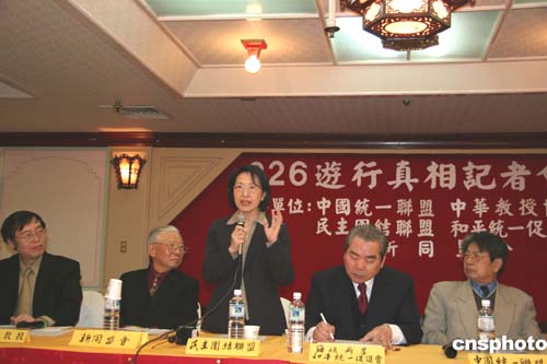 中新社臺北三月二十日電(記者 趙江濤 董會峰)中國統(tǒng)一聯(lián)盟、中華教授協(xié)會、民主團(tuán)結(jié)聯(lián)盟、和平統(tǒng)一促進(jìn)會、新同盟會今天在此間舉行“三二六游行真相聯(lián)合記者會”。與會人士指出,以所謂“反‘反分裂法’”、“反并吞”為由發(fā)動“三二六”游行,因果倒置、不負(fù)責(zé)任,對臺灣民眾沒好處,也無益于兩岸關(guān)系改善。