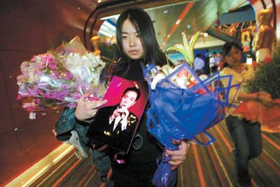 雖然張國榮已經(jīng)離開了近兩年,但是他的影迷卻一直沒有忘記他。昨天,當(dāng)記者來到影片《異度空間》首映式現(xiàn)場時(shí)發(fā)現(xiàn),現(xiàn)場已經(jīng)聚集了上百位張國榮的影迷,在影片海報(bào)旁擺滿了他們送來的白玫瑰和白百合,上面還插著“哥哥”的生前照片。而影院也配合播放著張國榮的歌曲,很多歌迷也在小聲地隨著哼唱。