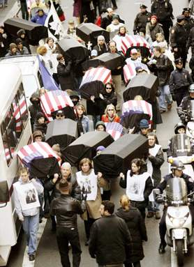 在英國(guó)首都倫敦,大約有4.5萬名民眾19日參加了以“讓軍隊(duì)回家”為主題的游行。游行民眾從海德公園出發(fā),經(jīng)過美國(guó)駐英大使館,前往特拉法加廣場(chǎng)舉行示威集會(huì)。他們一路高呼“喬治·布什……山姆大叔,伊拉克將是你的越南”等口號(hào),并把一具寫有“十萬死者”字樣的黑色假棺材擺放在美國(guó)駐英使館門外。