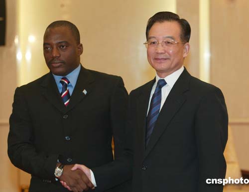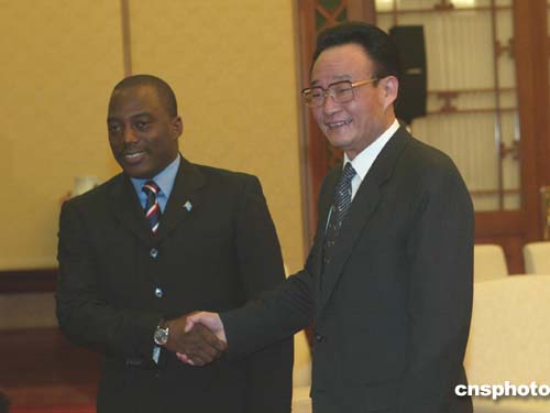 中新社北京三月二十二日電(記者齊彬)中國全國人大常委會委員長吳邦國、國務(wù)院總理溫家寶今天下午在人民大會堂分別會見了來訪的剛果民主共和國總統(tǒng)卡比拉。