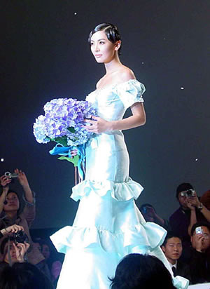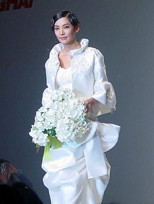 中新網(wǎng)3月24日電 據(jù)新聞晚報(bào)報(bào)道,昨天(23日)下午,在世貿(mào)商城的韓國時(shí)裝紡織博覽會(huì)上,韓國明星金素妍、鄭俊鎬身穿韓國頂級(jí)時(shí)裝大師AndreKim(安德烈·金)設(shè)計(jì)的最新服裝舉行了一場別開生面的婚紗秀,贏得了中國影迷的熱烈歡呼。下午三點(diǎn),婚紗秀現(xiàn)場正式開放,爭相涌進(jìn)的觀眾讓表演現(xiàn)場一時(shí)陷入癱瘓。主辦方不得不現(xiàn)場趕人,沒有邀請(qǐng)函的觀眾一律“清理”。當(dāng)金素妍和鄭俊鎬雙雙出現(xiàn)在舞臺(tái)上時(shí),歡呼聲伴隨著閃光燈爆發(fā)出來,出現(xiàn)了仿佛是搖滾樂演唱會(huì)的情景。特別是當(dāng)鄭俊鎬輕吻金素妍前額時(shí),一些女影迷當(dāng)場流出了熱淚。