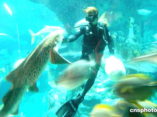 香港海洋公園海洋館的潛水喂養(yǎng)員現(xiàn)場表演。作者:趙振清