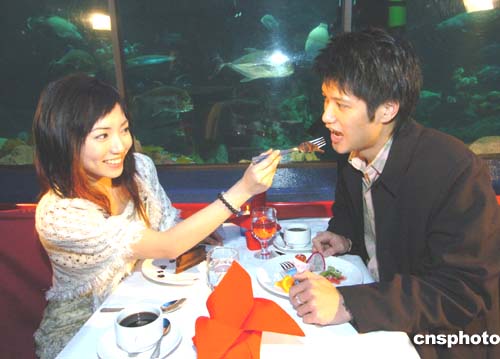 香港海洋公園復(fù)活節(jié)期間在海洋館推出“海底晚宴”﹐在品嘗美食的同時可欣賞到各種迷人的海洋生物在餐桌旁邊往來游動﹐別有一番風(fēng)趣。作者:趙振清