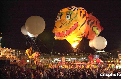 日本愛知世博會(huì)三月二十五日開展。當(dāng)晚,在世博廣場舉行慶祝表演“生命的節(jié)日”,一個(gè)巨大的虎形熱氣球款款升空,場面頗為壯觀。作者:王健