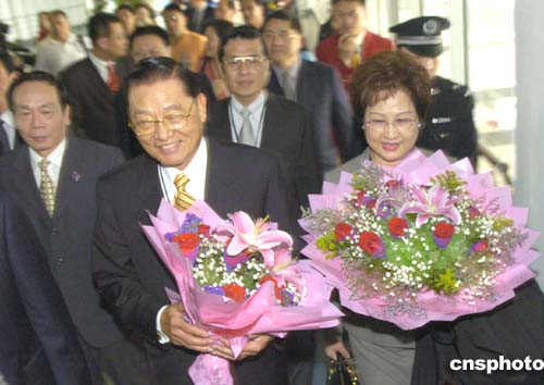 中國國民黨副主席江丙坤率領(lǐng)的國民黨高層大陸參訪團一行三十四人,二十八日下午飛抵廣州白云國際機場,開始對大陸進行參觀訪問。參訪團在機場受到熱烈歡迎。作者:羅仰明