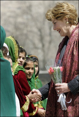 在勞拉訪問(wèn)阿富汗期間,美國(guó)教育部長(zhǎng)瑪格麗特·斯拜林斯一直在其左右陪同。