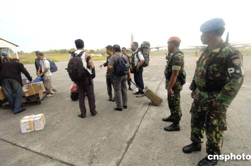 3月31日,印度尼西亞棉蘭某軍用機(jī)場召集世界各地電視臺及報章記者,安排乘當(dāng)?shù)剀娪蔑w機(jī)到尼亞斯島災(zāi)區(qū)采訪。作者:洪少葵
