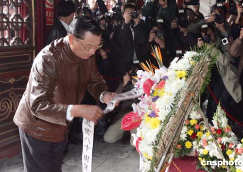 中國(guó)國(guó)民黨副主席江丙坤三月三十一日攜參訪團(tuán)全體成員,拜謁北京香山碧云寺內(nèi)的孫中山紀(jì)念堂,并敬獻(xiàn)花圈。作者:毛建軍