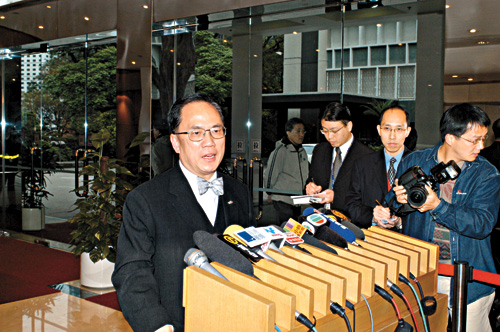曾蔭權(quán)、律政司司長梁愛詩、政制事務(wù)局局長林瑞麟昨日開始分批會見立法會議員,昨日更率先與民建聯(lián)及民主黨的立法會議員會面。曾蔭權(quán)表示,會面的主要目的是希望探討所有實際而可行的方法,盡量確保在七月十日舉行的行政長官選舉可以順利進行。他說:“現(xiàn)時香港市民普遍都有一個期望,希望我們在七月十日能夠順利產(chǎn)生一位行政長官,能夠掃除所有因為行政長官出缺而可能受影響的政府運作,以及社會活動,和一切不明朗的因素,特區(qū)政府與立法會議員也有同樣的責(zé)任去照顧所有市民的顧慮!