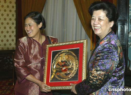 國務委員陳至立在北京向泰國公主詩琳通贈送了一幅中國K金龍鳳繡作為五十歲生日禮物。作者:廖文靜