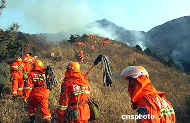 4月4日,河北省井徑縣南王莊鄉(xiāng)蘆莊村的金華寺山旅游景點,發(fā)生大面積火災。河北省森林防火應急分隊武警緊急出動300余名兵力趕赴火災現(xiàn)場,經(jīng)過5個多小時的激烈奮戰(zhàn),終將熊熊大火撲滅。據(jù)查大火由清明燒紙引發(fā)。圖為武警官兵奔赴目的地。作者:余洪恩